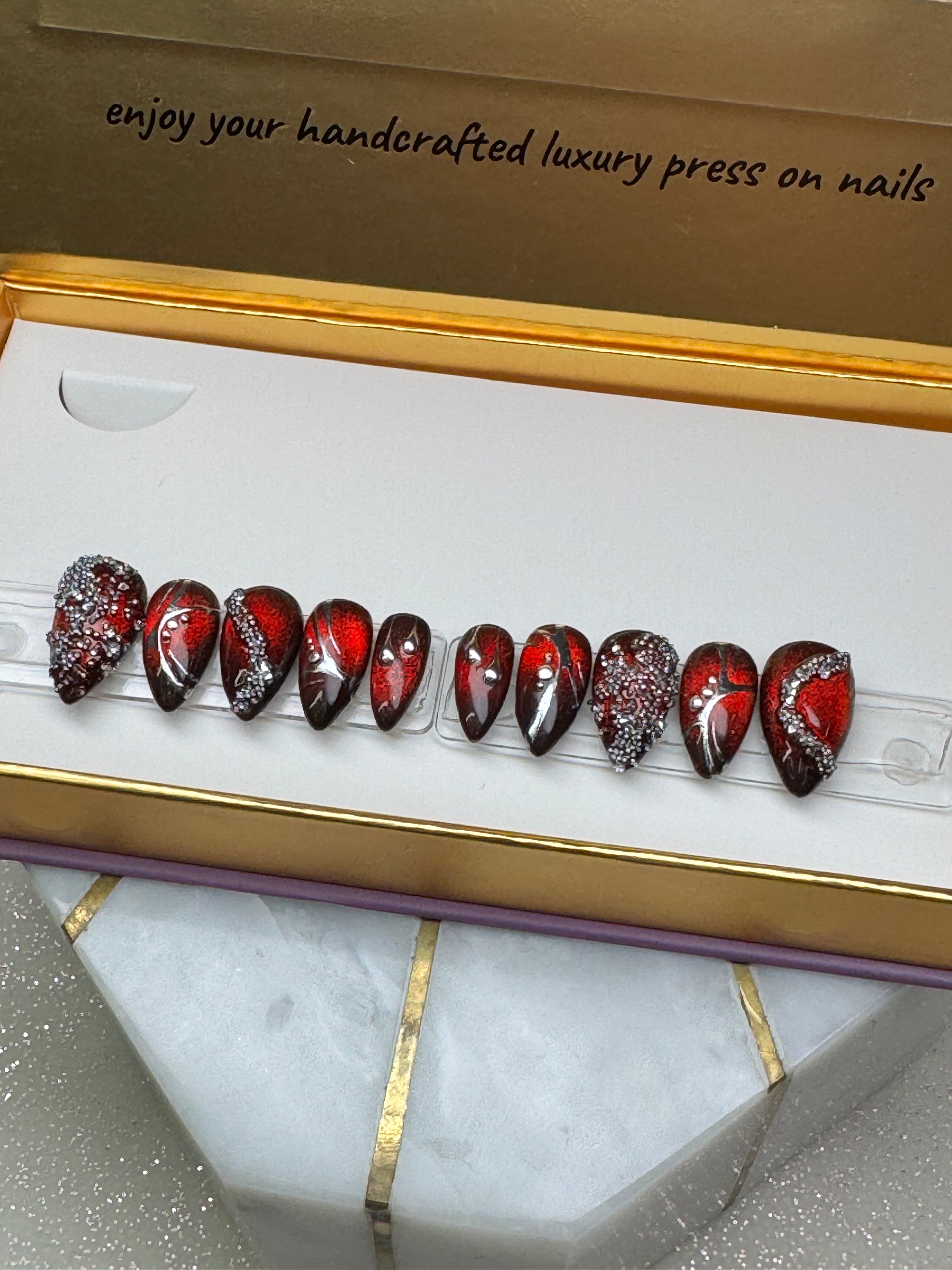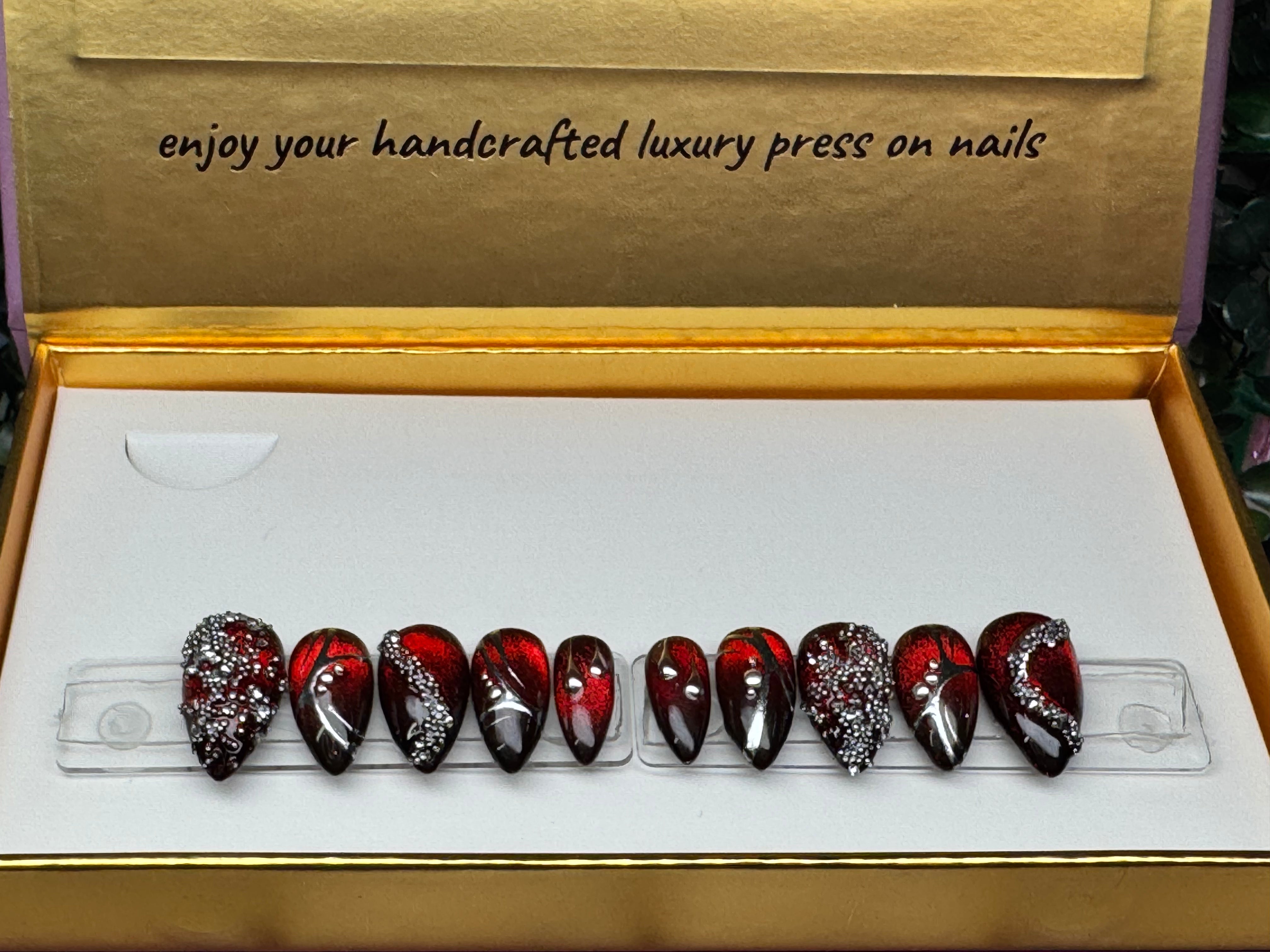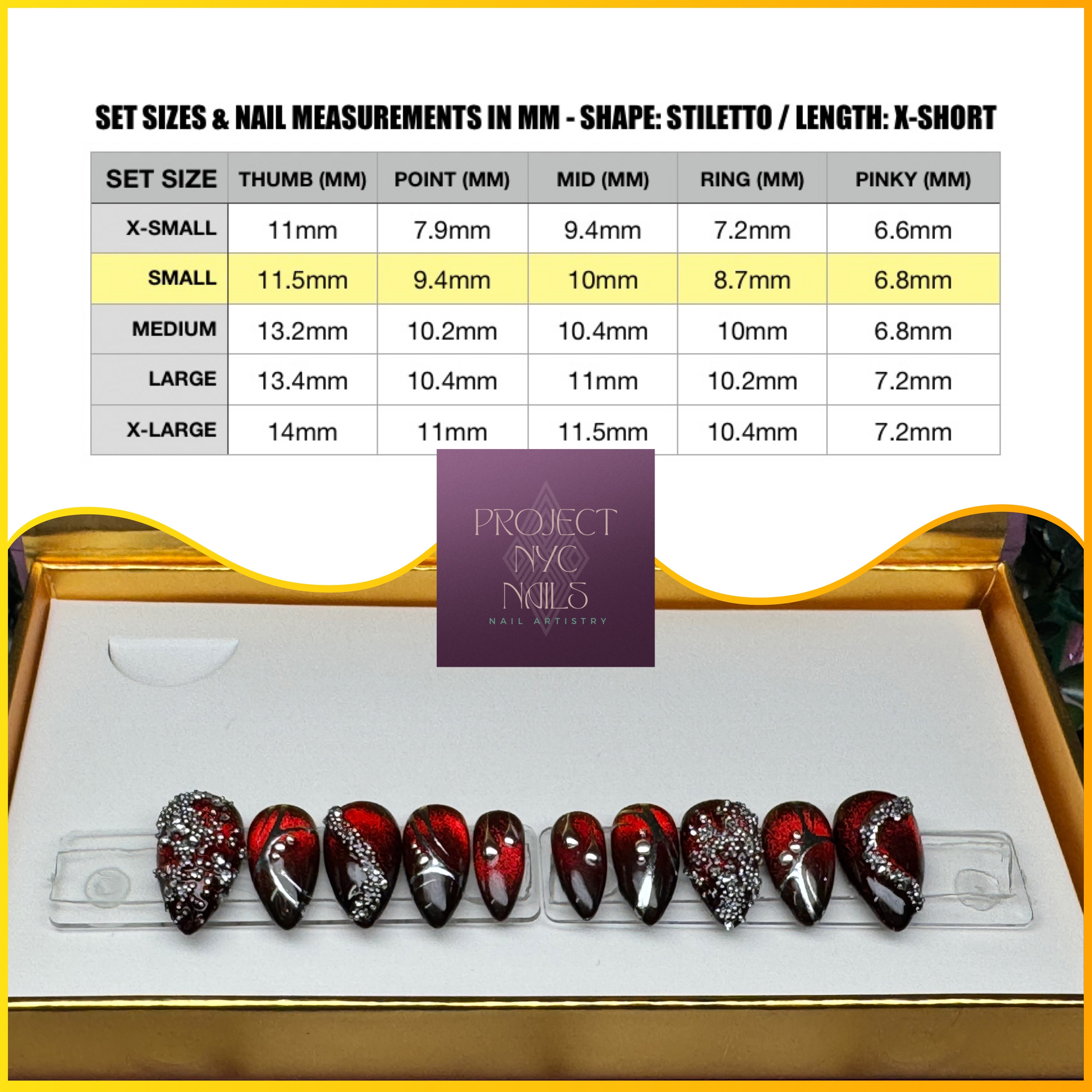 This is a set of 10 nails, 5 nail sizes for each hand. SHAPE: Stiletto LENGTH: X-Short Set Size: SMALL... Read more