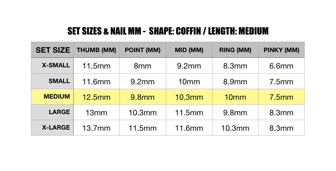This is a set of 10 nails, 5 nail sizes for each hand. SHAPE: ALMOND LENGTH: MEDIUM Set Size: Medium... Read more