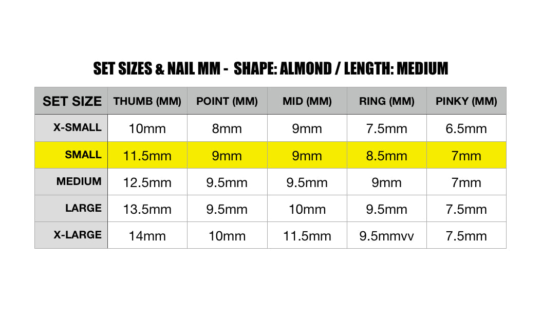 This is a set of 10 nails, 5 nail sizes for each hand. SHAPE: ALMOND LENGTH: MEDIUM Set Size: SMALL... Read more